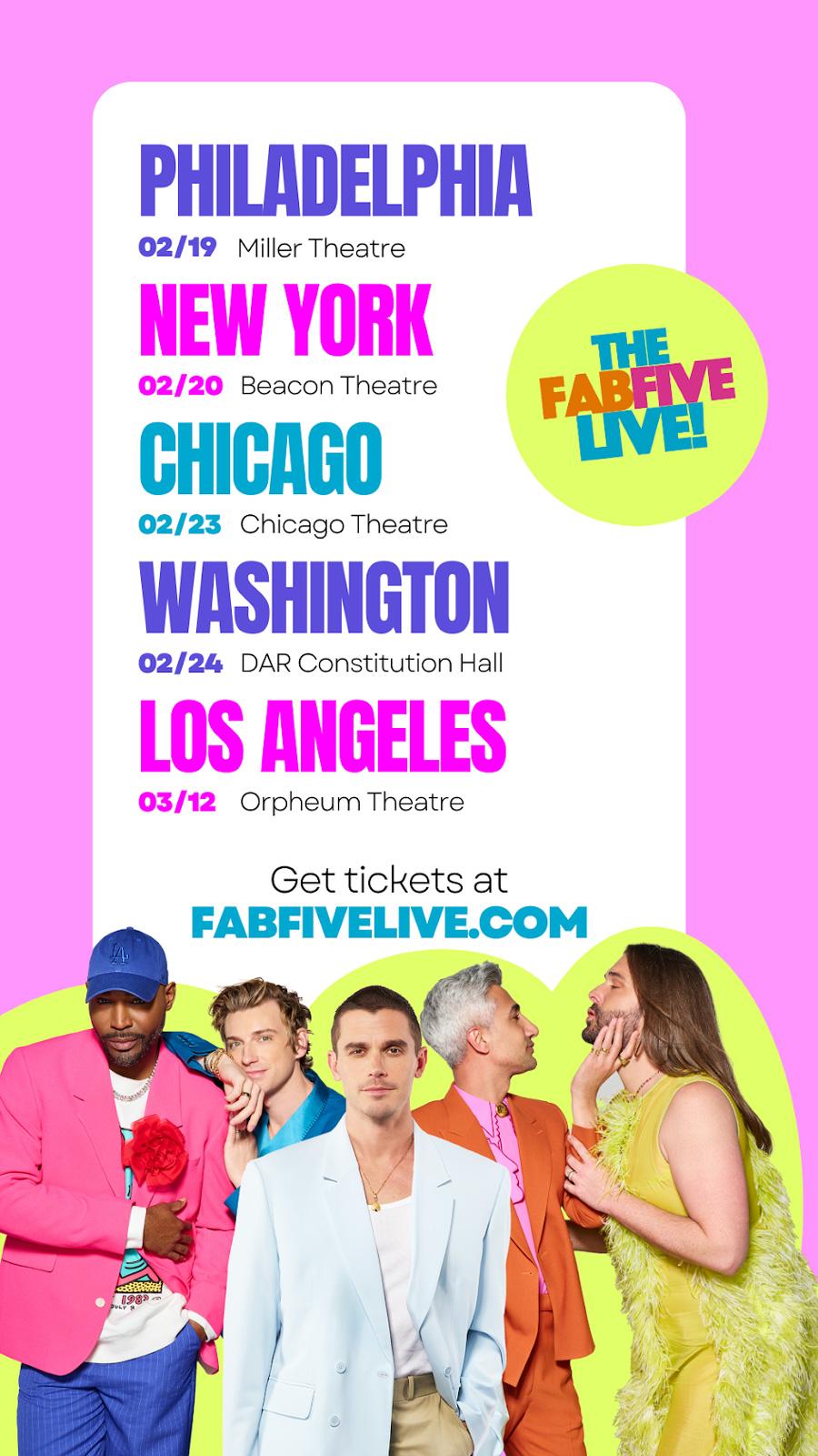 After two decades of Queer Eye and for the first time ever, the stars are bringing the magic of the hit Netflix series directly to live audiences! The Fab Five Live! unites Karamo Brown, Tan France, Antoni Porowski, Jonathan Van Ness, and newest cast member Jeremiah Brent on stage for multiple nights filled with laughter, heartfelt stories, and the unforgettable spirit of Queer Eye across the United States. Moderated by acclaimed comedian Michelle Collins, The Fab Five Live! kicks off in Philadelphia on February 19th and includes stops in Los Angeles, Chicago, Washington DC and New York City Queer Eye, which first premiered in 2003, introduced audiences to five queer men and gave a platform for conversations around equality and acceptance globally. Tickets are on sale now: https://fabfivelive.com.